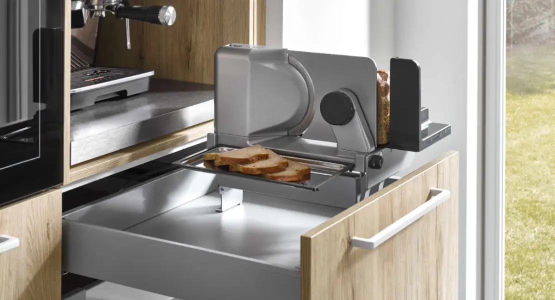 Kuhalna plošča z integrirano izvlečno napo in kavomat na izvlečni površini. Za vse, ki si želite, pa se rezalnik kruha lahko dvigne iz spodnjega predala. Tako priročno je lahko življenje.