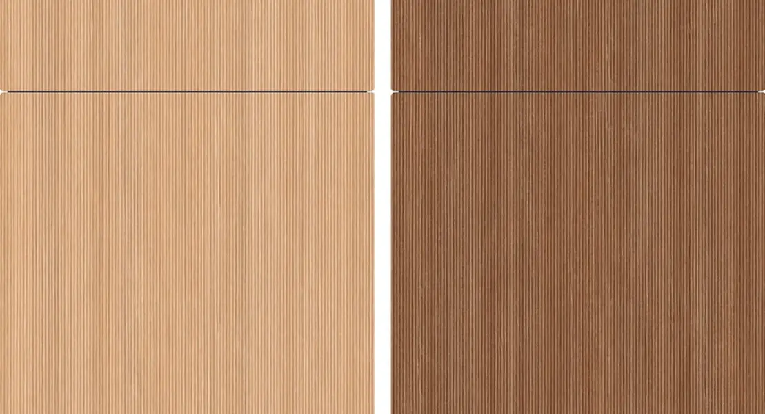 Elegantne furniraste rebraste ličnice so pravi trend: razporejene v vrstah ustvarjajo občutek globine z edinstvenim učinkom. Obe dekorativni izvedbi ponujata sodobne možnosti načrtovanja, hkrati pa prinašata linearno strukturo v kuhinjo, kar postavlja nove oblikovalske standarde.