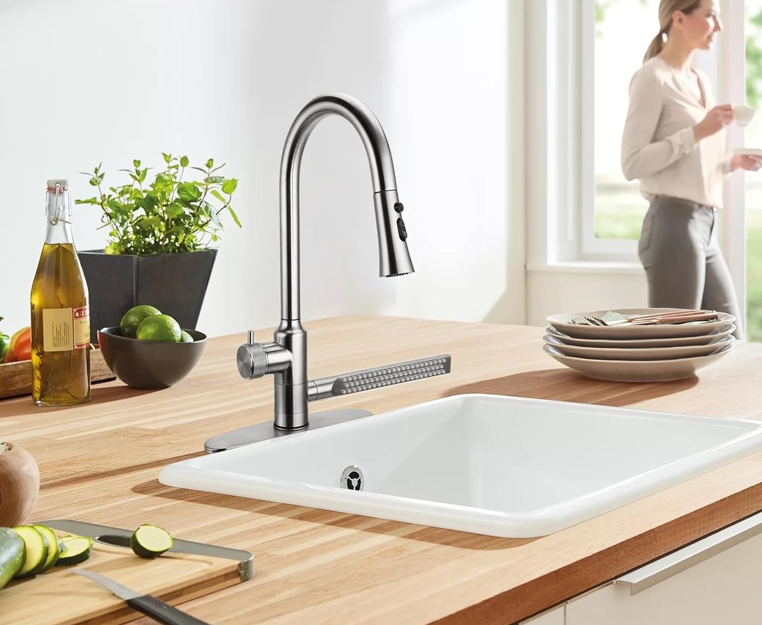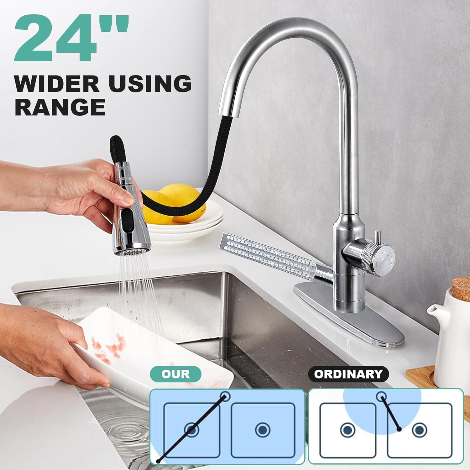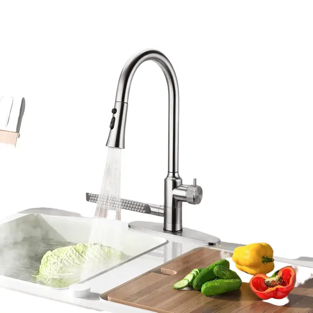 Kuhinjska armatura 4v1 v srebrni barvi predstavlja sodobno in izjemno večnamensko rešitev, ki v vsako kuhinjo prinaša popolno kombinacijo estetike in praktičnosti. Izdelana je iz visokokakovostnega nerjavečega jekla 304, kar zagotavlja visoko stopnjo vzdržljivosti, naravno odpornost proti koroziji ter brezčasen eleganten videz. Zasnova armature omogoča enostavno in natančno prilagajanje temperature med toplo in hladno vodo, kar bistveno poveča udobje pri vseh opravilih ob pomivalnem koritu. Zaradi svoje premišljene oblike in naprednih funkcij je ta izdelek idealna izbira za uporabnike, ki iščejo zanesljivost in učinkovitost pri vsakodnevnem delu v kuhinji.