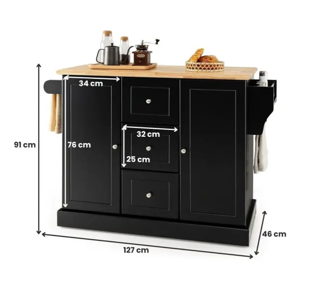 Delovna plošča iz gumijastega lesa: Naša prostorna delovna plošča iz gumijastega lesa meri 104 cm (D) x 46 cm (Š) in vam zagotavlja dovolj prostora za obdelavo in serviranje hrane. Medtem ima široka delovna plošča gladko površino, ki jo je izjemno enostavno očistiti z vlažno krpo.
