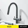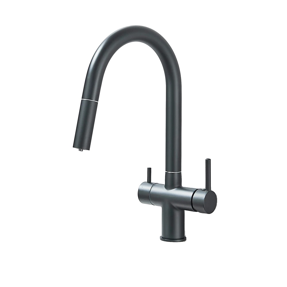 Kuhinjska pipa s potegljivo prho, dvojni ročaj za nadzor temperature, sodoben dizajn iz mesinga, mat čr