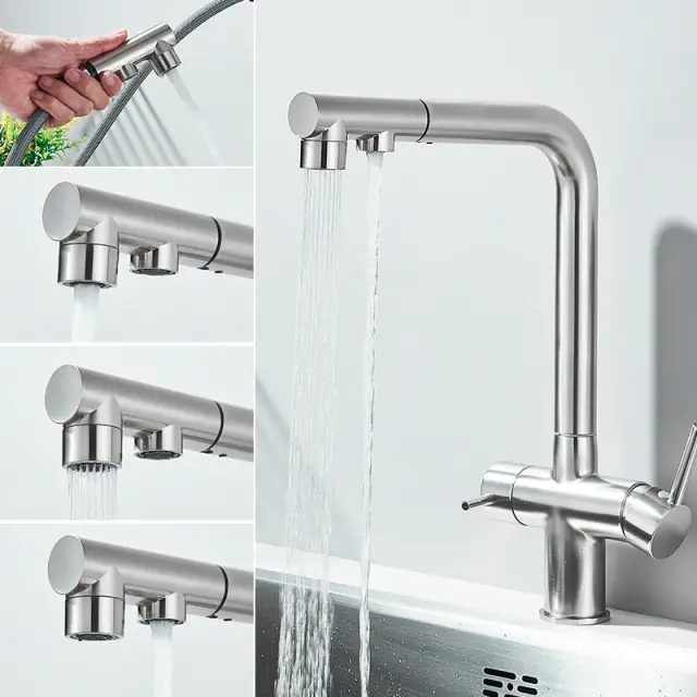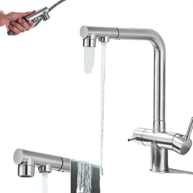 Kuhinjska pipa za filtrirano vodo, dvojna ročica, 360° rotacija, izvlečna prha, brušen nikelj