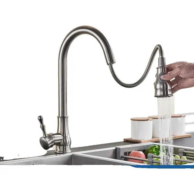 Kuhinjski izvlečni pipa, zložljiva šoba, trdna medenina, brušen nikelj