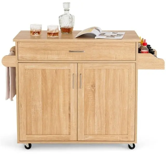 Voziček je opremljen s prostorno delovno površino, velikim predalom in omarico ter ponuja veliko prostora za shranjevanje posode, kozarcev, hrane itd. Police v notranjosti je mogoče nastaviti v treh položajih, tako da lahko razmik med policami prilagodite glede na shranjene predmete. Posebej zasnovana stojalo za začimbe in držalo za brisače vam omogočata, da lahko kadar koli enostavno odstranite posode za brisače in začimbe. Opremljen je s 4 univerzalnimi kolesi (2 z zavorami), ki zagotavljajo mobilnost in varnost. Ne glede na to, ali želite dodatno delovno površino ali bolje organizirati zaloge, je naš kuhinjski voziček idealna izbira.