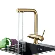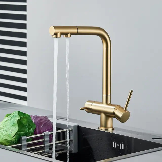 Kuhinjski pipa iz medenine s filtrom, dvojna ročica, vroča in hladna voda, sodoben dizajn, Brušeno zlato