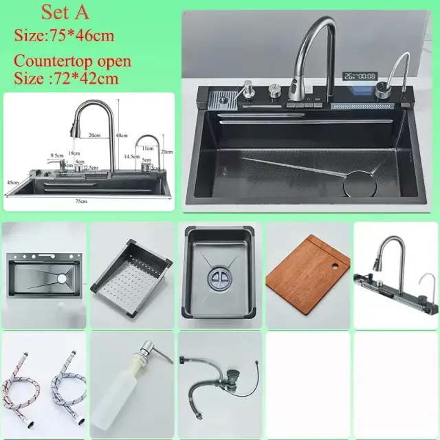 Kuhinjski umivalnik iz 304 nerjavečega jekla, velika velikost, pipa z digitalnim prikazom, 75X46 Set A