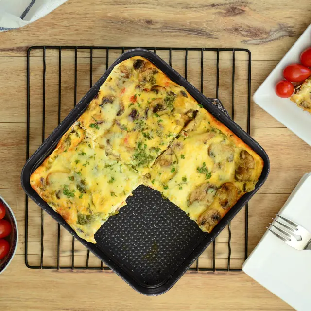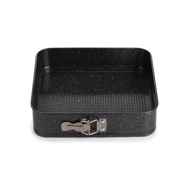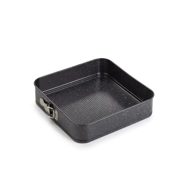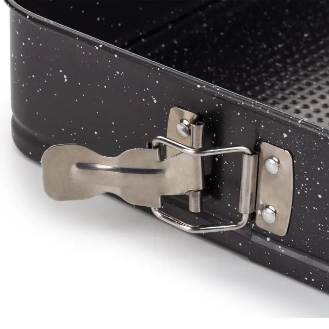 Kvadratni pekač Rosmarino BakerPro je vse, kar potrebuješ za popolno peko tort, biskvitov, pit ali drugega peciva. Pekač v izgledu marmorja ima snemljiv obod z nerjavečo zaklopko, ki omogoča enostavno odpiranje in zapiranje pekača ter hitro odstranjevanje oboda. Neoprijemljiv premaz ILAG švicarske kakovosti poskrbi za enakomerno razporeditev toplote in peko z minimalno maščobe, saj se hrana ne oprijema pekača. Zaradi sestave iz karbonskega jekla je pekač odporen tudi na visoke temperature, do 230 °C, primeren za hrambo v hladilniku in zamrzovalniku. Trpežna in zanesljiva zasnova za profesionalne pekovske rezultate.