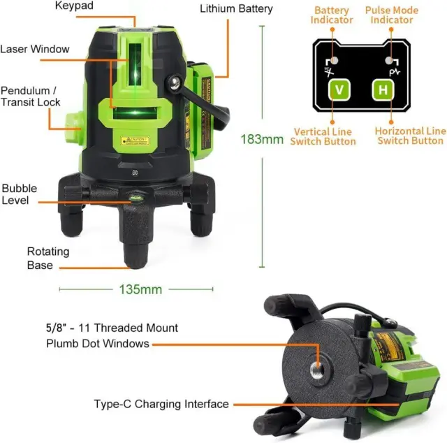 Veččrtni laserski nivo projicira eno vodoravno črto, štiri navpične črte in navpično točko – za izravnavo, poravnavo navpičnih in kvadratnih aplikacij.