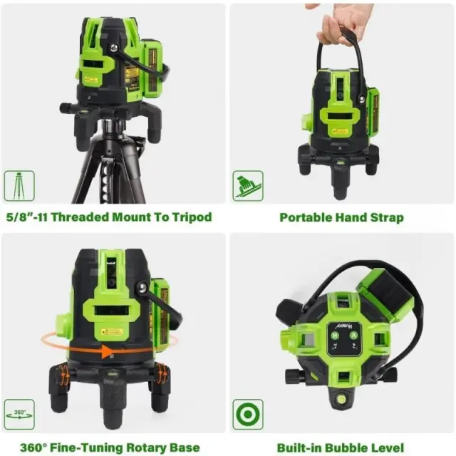 Vgrajeno fino nastavljivo podnožje: za 360-stopinjsko vodoravno in višinsko nastavitev v kombinaciji z vgrajeno mehurčasto tehtnico omogoča prilagajanje položaja laserskega orodja na neravnem ali nagnjenem terenu.
