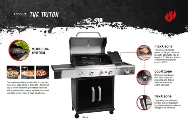 | Dodatno | 4 kolesa z možnostjo zaklepanja, zaščitni pokrov z vgrajenim termometrom, LED osvetljeni upravljalni gumbi, ročaji iz brušenega nerjavečega jekla, držalo za jedilni pribor, zložljiva stranska mizica, odstranljiva posoda za kapljanje |