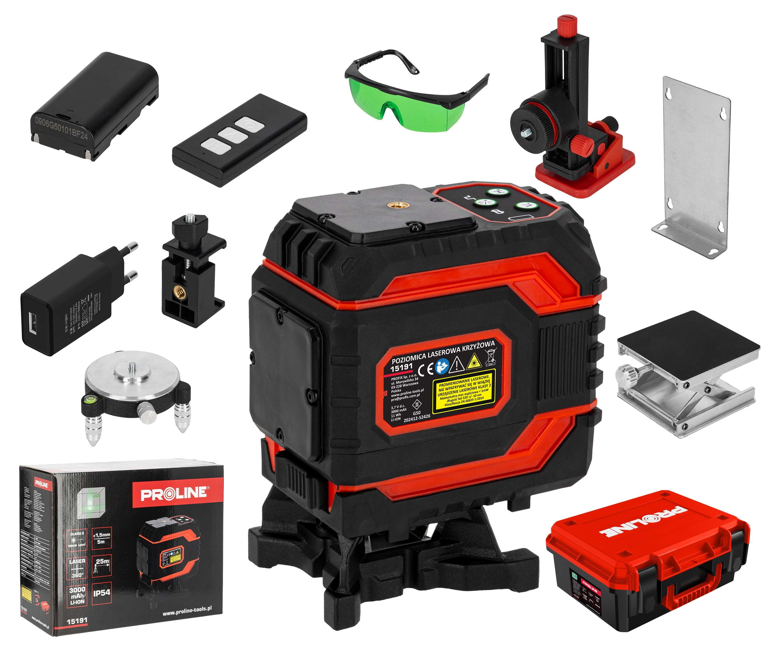 Laserski nivelir 360° križni laser zeleni samonivelirni 2D komplet Proline 15191 Profesionalni laserski nivelir PROLINE s certifikatom CE je zanesljivo orodje za natančne meritve v vseh pogojih. Opremljen je z zelenim laserskim žarkom (520 ± 10 nm), ki je do 4-krat bolj viden kot tradicionalni rdeči, in zagotavlja delovni doseg do 25 m ter natančnost ±1,5 mm/5 m. Zahvaljujoč funkciji samoniveliranja v območju ±3° in možnosti vklopa vodoravne in/ali navpične projekcije je delo z napravo hitro in priročno. Stopnja zaščite IP54 zagotavlja odpornost na prah in vlago, vrtljiva glava in močan magnet v držalu pa omogočata enostavno pritrditev na stativ (navoj 1/4 in 5/8) in kovinske profile. Napajanje zagotavljajo učinkovite litij-ionske baterije (3000 mAh v 2D-modelu). Komplet vključuje: očala za izboljšanje svetlobnega snopa, polnilnik, magnetni nosilec, vrtljivo podnožje, daljinski upravljalnik in trpežno torbico za prenašanje. Ključne značilnosti: CE certifikat – potrjena kakovost in varnost Zaščitni razred IP54 – zaščita pred prahom in vlago Natančnost merjenja: ±1,5 mm/5 m Delovni doseg: do 25 m Zeleni žarek (520 ± 10 nm) – 4× bolj viden kot rdeči Razred laserja: 2, moč ≤1 mW Samoniveliranje: območje ±3° ±1° Možnost navpične in/ali vodoravne projekcije Zaklep za delo na klancu 360° vrtljiva glava Pritrdilni vijak – navoj 1/4” in 5/8” za stative Močan magnet – montaža na kovinske profile Napajanje: Li-ionska baterija (3000 mAh v 2D modelu) Celoten komplet dodatkov: očala, polnilnik, magnetno držalo, vrtljivo stojalo, daljinski upravljalnik, transportna torbica
