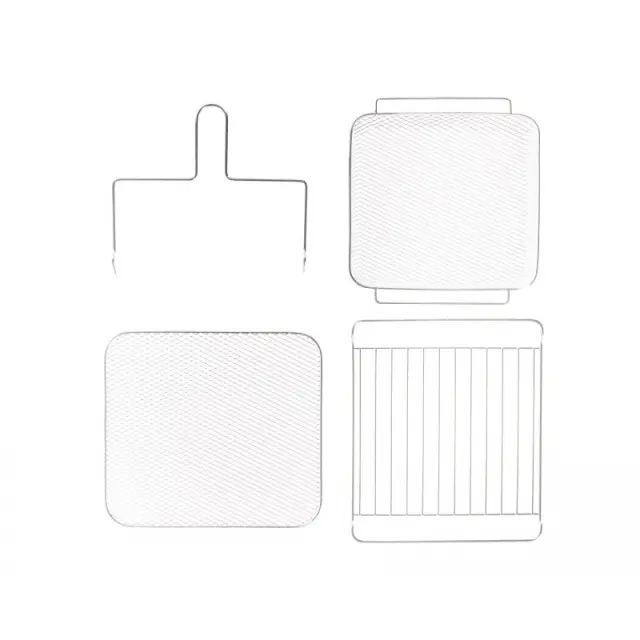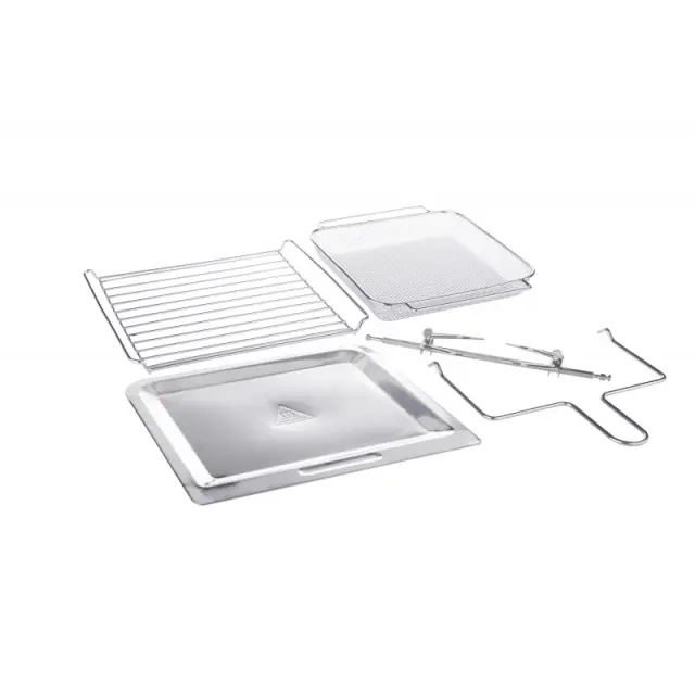 ?7 kosov dodatne opreme v osnovnem pakiranju: 1 klasična mrežica za pekač ali različne modele, 1 vrtljiva košarica za pomfrit, 1 globlja mrežica za peko piščančjih krilc, 1 ploščata mrežica za sušenje sadja ali gob, 1 odcejalni pekač, ki zajame maščobo in olje, raženj za celega piščanca, držalo