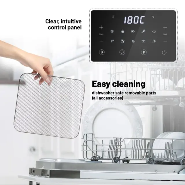 Upravljanje Air Fryer Oven je intuitivno in ga lahko obvlada vsak. Želeni program nastavite na zaslonu na dotik, na katerem lahko nadzirate temperaturo in čas priprave. S pomočjo prozornih vrat in osvetlitve notranjosti lahko jed enostavno nadzirate tudi vizualno. K pečici sodi tudi bogata dodatna oprema, ki jo je mogoče pomivati v pomivalnem stroju. Za izjemno preprosto čiščenje so vratca v celoti snemljiva. Razveselili vas bodo tudi všečen minimalistični dizajn, video vodič in kuharska knjiga z domiselnimi recepti, ki je priložena pakiranju.