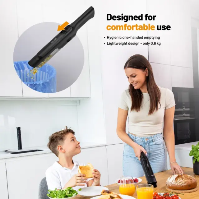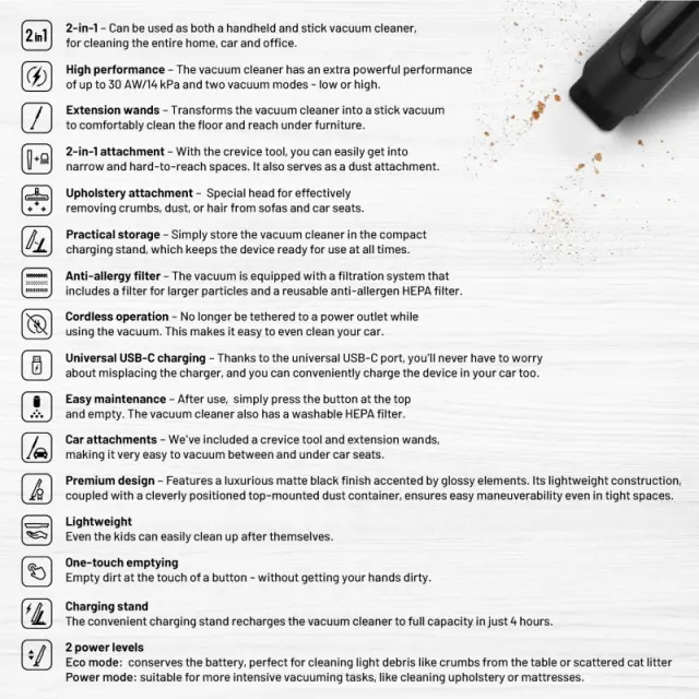 Ročni sesalnik v vrhunskem dizajnu s črno mat površino in bleščečimi elementi je opremljen s praktičnim stojalom za polnjenje s polnilnikom USB-C, zato je vedno pripravljen na uporabo in ne zavzame veliko prostora. Zahvaljujoč pralnim filtrom boste privarčevali, saj jih ni treba nenehno menjavati. Zelo enostavno in higienično je tudi vzdrževanje zbirne posode v zgornjem delu pri držalu, ki jo je treba samo odstraniti in izprazniti vsebino.