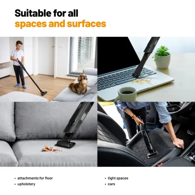 Lauben Hand Vacuum 2in1 120BC bo uporaben kot ročni sesalnik za hitro čiščenje ali za sesanje tal s priključitvijo podaljševalne palice. Kabli vas ne bodo ovirali nikjer, aparat samo napolnite prek kabla s priključkom USB-C. Zbirna posoda v zgornjem delu pri držalu omogoča sesanje tudi pod pohištvom ali na drugih težko dostopnih mestih, pri čiščenju katerih bo prišel prav tudi nastavek za špranje 2v1. Sedeže doma in v avtu pa boste udobno očistili s pomočjo nastavka za oblazinjeno pohištvo.