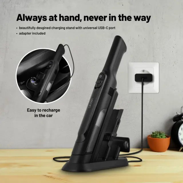 Poslovite se od kablov, zahvaljujoč polnjenju prek kabla s priključkom USB-C pri uporabi sesalnika ne boste več potrebovali vtičnice. Tako boste zlahka očistili tudi, na primer, avto.
