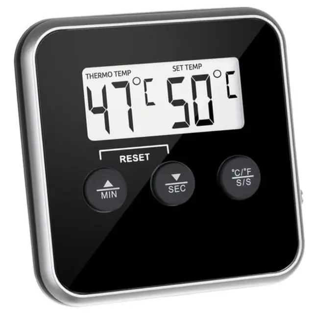 NADZORNA PLOŠČA + ČASOVNIK – termometer ima 3 gumbe, odgovorne za nadzor. Uporabna je funkcija časovnika z zvočnim signalom. Alarm se bo oglasil, ko poteče čas, ki ste ga vnaprej določili.