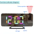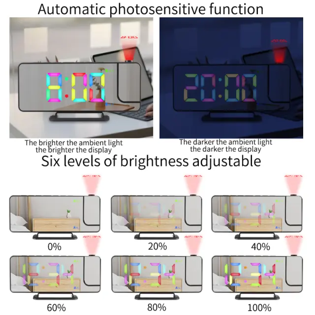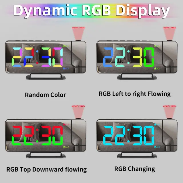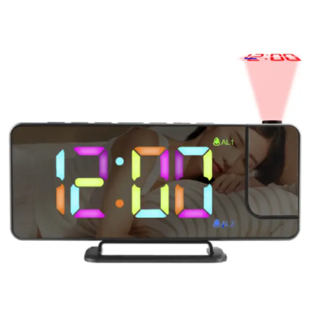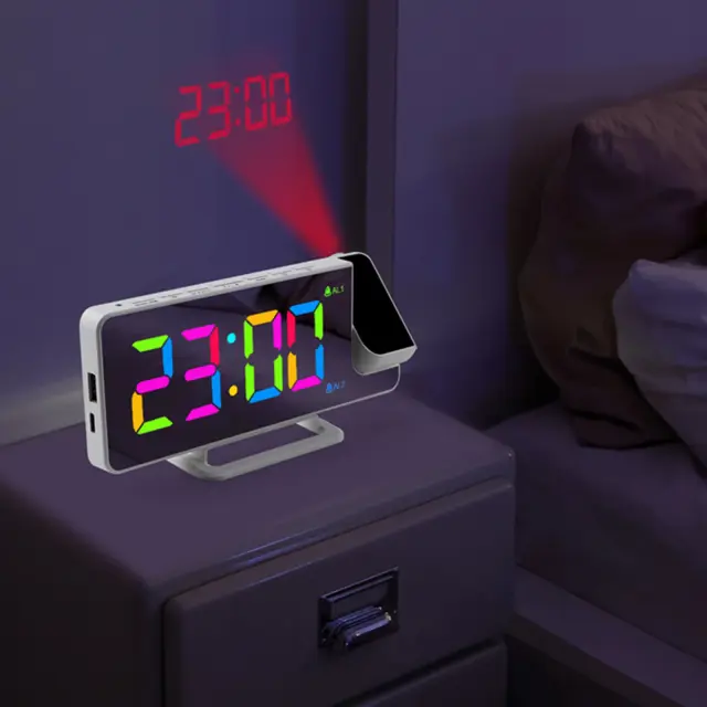 Barvit LED-zaslon: LED zrcalna projekcijska budilka ima živahni RGB barvni zaslon, ki ga je mogoče prilagoditi za prikaz več barv. Vaši nočni omarici ali mizi doda stilsko in osebno noto.