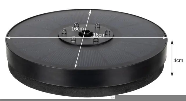 • SPECIFIKACIJA – barva: črna; število LED diod 6; RGB LED lučka; solarna plošča: 7V in 3W; izhod vodne črpalke: DC 4,5-12V; največji pretok vode: 180l / h; največja višina pršenja: 30-60 cm; kapaciteta baterije: 3,7 V / 900 mAh; mere (premer / višina): 16 cm x 4 cm; teža: 340 g; teža v paketu: 434 g.