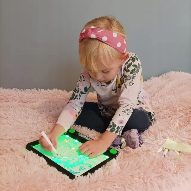 Tablica je opremljena z osvetlitvijo RGB, ki omogoča izbiro različnih barvnih načinov za poudarjanje vaših risb in besedil. Priloženi neon flomastri omogočajo risanje z intenzivnimi barvami, ki pod osvetlitvijo zažarijo v živahnih odtenkih.
