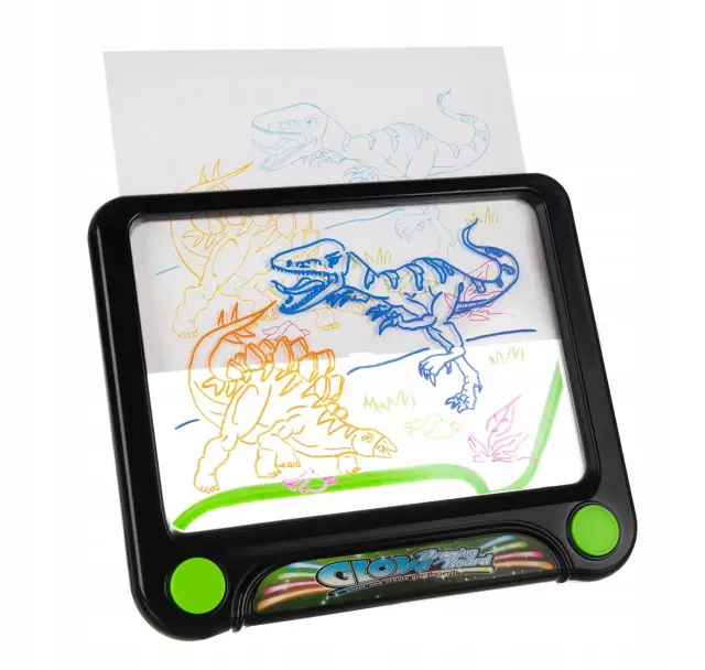 - BACKLIGHT LED – osnova vsebuje 5 LED diod, ki ustvarjajo veliko količino svetlobe, tako da je učinek fluorescence fenomenalen! Kako se začeti zabavati? Enostavno je. Predlogo z risbo postavite v svetlobno polje. Na ploščo reproducirajte tisto, kar je na šabloni, s posebnimi fluorescenčnimi markerji, če se vam zdi dovolj, lahko risbo naredite sami. Prižgi razsvetljavo. Barve markerjev se bodo spremenile, ko bodo izpostavljene svetlobi. Ne pozabite, da so najboljši rezultati vidni v temi.