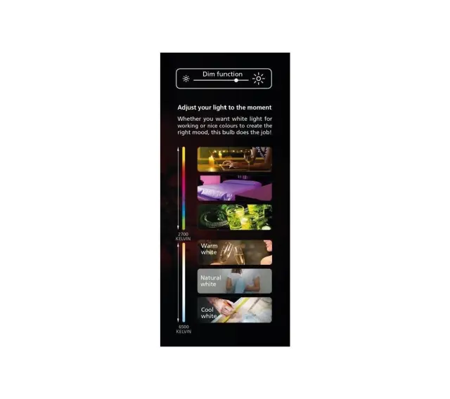 Vsaka barva ustvari svoje vzdušje. S pametno barvno svetilko lahko prilagodite barvo v vašem domu glede na vaše razpoloženje ali aktivnost. Spremenite barvo svetlobe v svetlo belo za trenutek koncentracije ali zatemnite luči za večerni zmenek. In če ste razpoloženi za zabavo, se lahko odpravite do konca z različnimi svetlimi barvami. Izberite idealno osvetlitev za vsak trenutek.