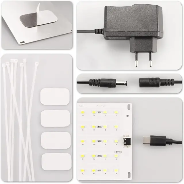 Enostavna namestitev in uporaba: Tanka in lahka zasnova omogoča enostavno namestitev v različne nastavitve. Preprosto priključite adapter in postavite svetlobno ploščo nad vaše rastline za optimalne rezultate.