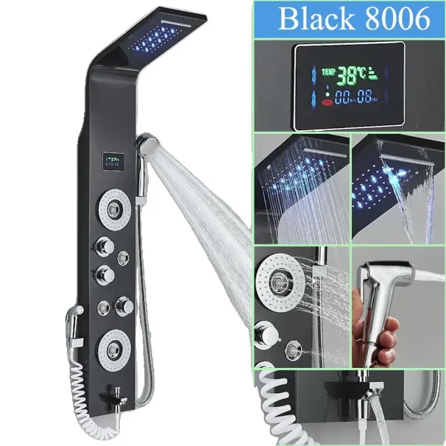 LED Teplomer na Sprchový Panel, 6 Vodných Módov, Odolná Nerezová Oceľ - Čierna-L-8006