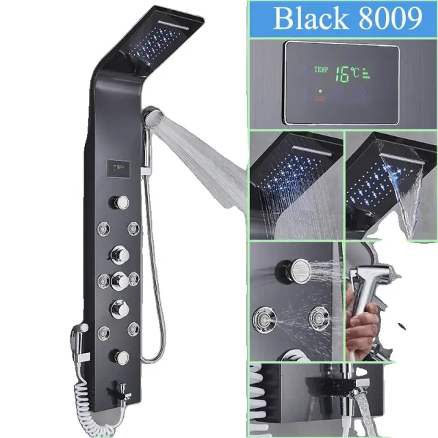 LED Teplomer na Sprchový Panel, 6 Vodných Módov, Odolná Nerezová Oceľ - Čierna-L-8009