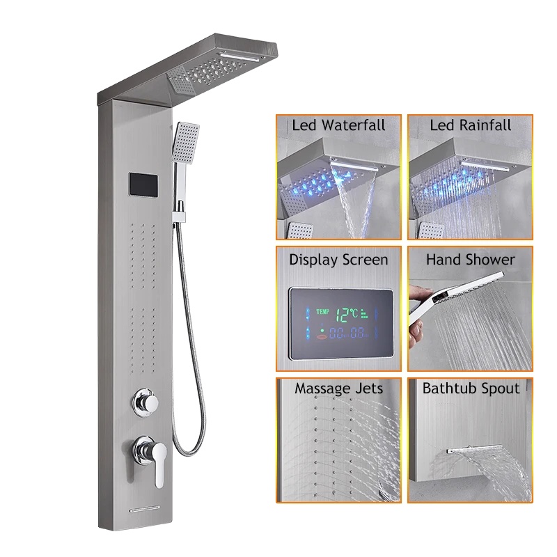 LED tuš panel, občutljiv na temperaturo, masažni curki, 8011 brušeni nikelj