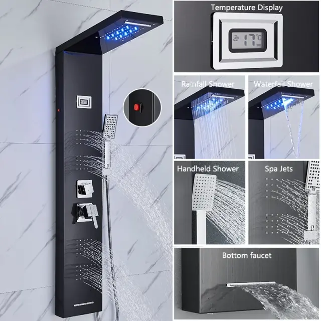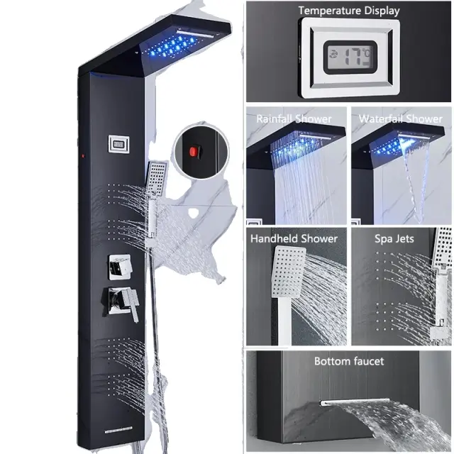 LED tuš panel, občutljiv na temperaturo, masažni curki, 8024 črn LED