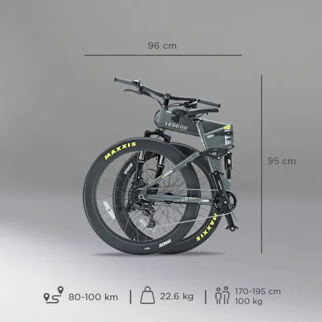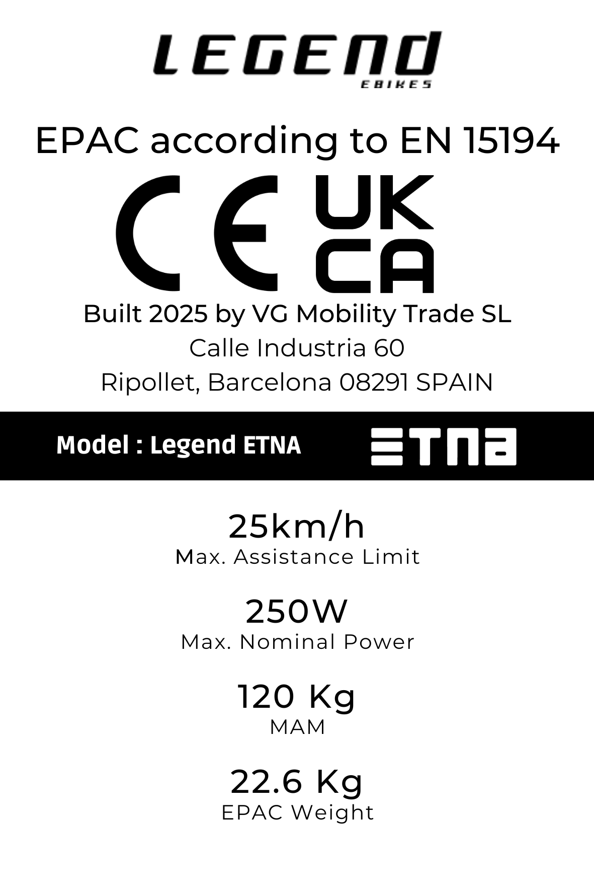 Legend Etna SR je zložljivo električno gorsko kolo z avantgardnim DNK, zasnovano tako za mesto kot za zahtevnejše poti. Nastalo je v okviru evropskega sodelovanja in združuje vsestranskost, zanesljivost ter pametno vgrajeno tehnologijo. Z 27,5-palčnimi kolesi ponuja udobje mestnega kolesa in zmogljivost gorskega kolesa, zato omogoča samozavestno vožnjo po zelo različnih terenih. Kar zadeva opremo, Etna SR stavi na višji razred: polno vzmetenje s vilico RockShox XC30 in zadnjim blažilnikom KS Kind Shock A5 za učinkovito blaženje neravnin, hidravlične kolutne zavore Shimano za postopno in močno zaviranje ter 11-stopenjski pogon SRAM NX za natančno in odzivno vožnjo. Pnevmatike Maxxis Pace zagotavljajo dober oprijem in stabilnost, tudi ko postane podlaga slabša. Električni sistem MAHLE Smartbike, razvit v Nemčiji, optimizira porabo energije in olajša upravljanje asistence. Joystick IWOC najnovejše generacije z gumbi in LED indikatorji omogoča enostavno izbiro stopnje pomoči ter hiter pregled stanja kolesa in baterije. Kolo je tudi povezljivo: prek Bluetootha aplikacija MySmartbike (iOS/Android) prikazuje podatke, kot so hitrost, nadmorska višina ali porabljene kalorije. Sistem je združljiv tudi z drugimi povezanimi napravami ter z zaslonom MAHLE Pulsar One (naprodaj ločeno). Zadnji brezkrtačni motor z močjo 250 W nudi pomoč do 25 km/h, z navorom 40 Nm in štirimi stopnjami asistence za prilagoditev vsaki situaciji. Ta različica je opremljena z odstranljivo Panasonic litij-ionsko baterijo (36 V), ki omogoča doseg do 100 km. Sistem upravljanja BMS optimizira učinkovitost in dolgo življenjsko dobo baterije. Polno polnjenje traja manj kot 6 ur s priloženim polnilnikom ali približno 3 ure s super polnilnikom (naprodaj ločeno). Ojačan aluminijast okvir vključuje sistem hitrega zlaganja: v manj kot 5 sekundah kolo postane kompaktno ter ga je enostavno prenašati ali shranjevati. Za prilagoditev uporabe je mogoče dodati različne dodatke (prtljažnik, blatnike, luči, torbe … odvisno od razpoložljivosti). Kolo je homologirano po standardu EN 15194