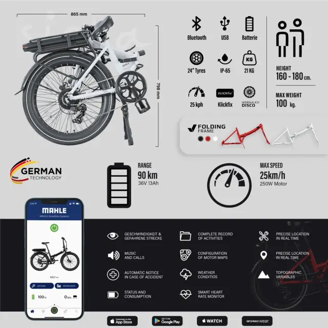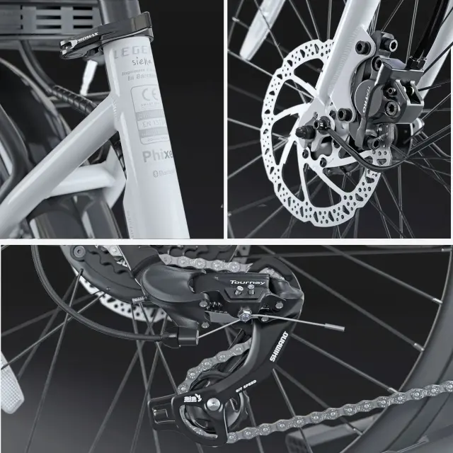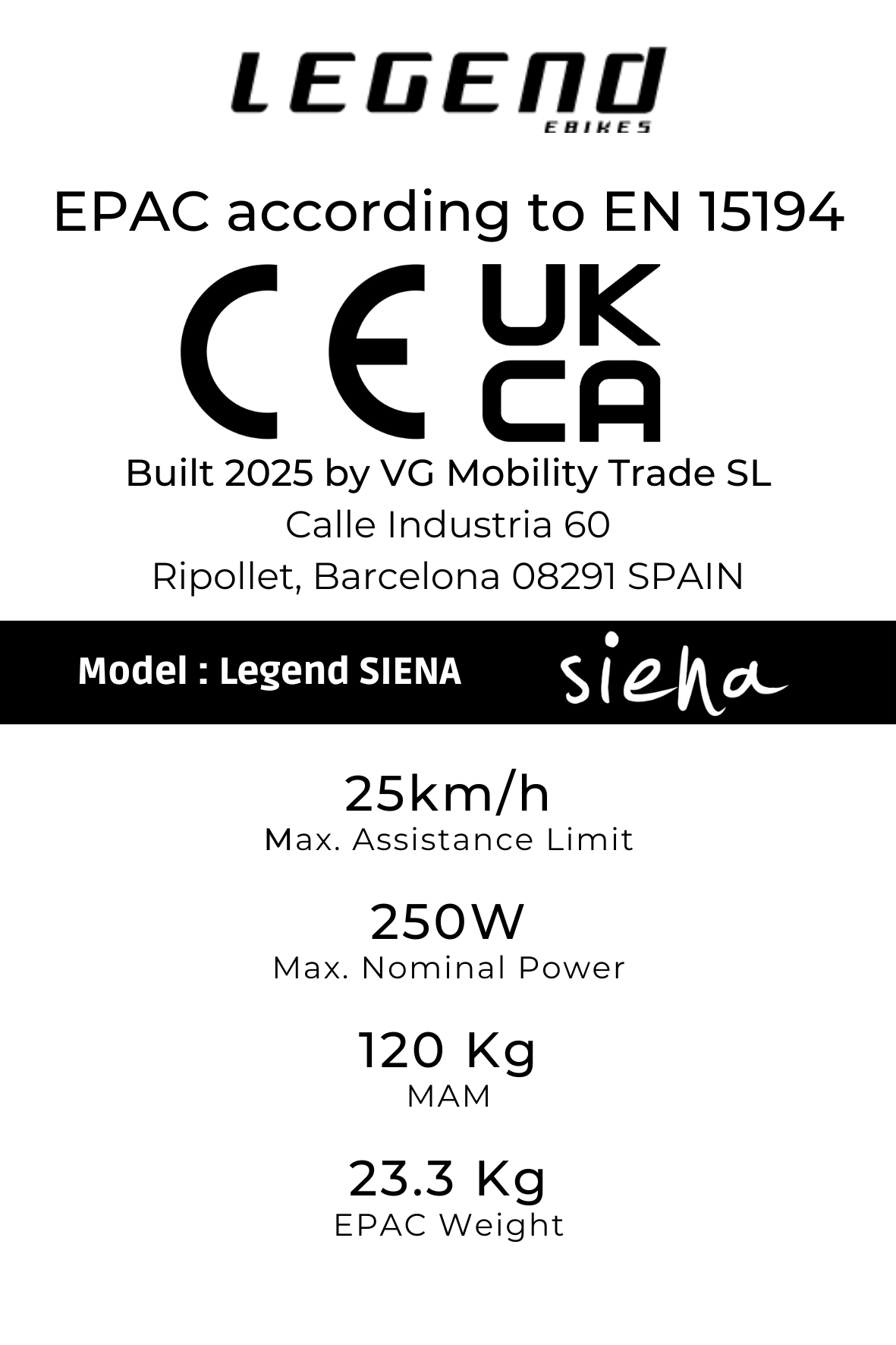 S sodobno reinterpretiranim vintage slogom in čisto linijo je Legend Siena zložljivo električno kolo, zasnovano za popolno ravnovesje med eleganco, udobjem in vsakodnevno praktičnostjo. Kot prodajna uspešnica blagovne znamke izstopa po skrbni kakovosti izdelave, zelo prijetni vožnji in povezanih tehnologijah, ki izboljšujejo mestno izkušnjo. Siena ponuja odlično ravnovesje med udobjem in kompaktnostjo. Ergonomski sedež, 7-stopenjski menjalnik Shimano in hidravlične kolutne zavore zagotavljajo varno, tekočo in nadzorovano vožnjo. Kolesa s premerom 24 palcev in pnevmatikami z učinkom »full suspension« prinašajo občutek mehkobe in stabilnosti, hkrati pa ohranjajo prednosti zložljivega kolesa. Ta vmesni premer je idealen za tiste, ki želijo več udobja kot pri 20-palčnih kolesih, brez izgube praktičnosti zlaganja. Sistem MAHLE Smartbike optimizira porabo energije in poenostavi upravljanje. Joystick IWOC (gumbi + LED) omogoča enostavno upravljanje asistence ter hiter pregled stanja kolesa in baterije. Prek Bluetooth povezave Siena deluje z aplikacijo MySmartbike (iOS/Android), ki prikazuje podatke, kot so hitrost, nadmorska višina ali porabljene kalorije. Združljiva je tudi z drugimi povezanimi napravami ter z zaslonom MAHLE Pulsar One (naprodaj ločeno). Zadnji brezkrtačni motor z močjo 250 W nudi pomoč do 25 km/h, z navorom 40 Nm in štirimi stopnjami asistence. Odstranljiva litij-ionska baterija 36 V (13 Ah / 470 Wh) vključuje sistem BMS (toplotni in elektronski senzorji) za optimizirano upravljanje pri polnjenju in praznjenju ter omogoča doseg do 90 km glede na pogoje. Polnjenje traja manj kot 6 ur s priloženim polnilnikom ali približno 3 ure s super polnilnikom (naprodaj ločeno). Ojačan aluminijast okvir in hitro zlaganje omogočata, da se kolo zloži v manj kot 5 sekundah. Zloženo postane kompaktno (87 × 80 × 46 cm) in tehta približno 21 kg z baterijo, kar olajša prenašanje in shranjevanje. Siena vključuje tudi vrhunsko opremo: integrirane LED luči Spanninga Kendo+, vodotesne konektorje IP67, vrtljiv ročaj Revoshift, sprednji KlickFix nosilec za košaro/dodatke ter zadnji prtljažnik z nosilnostjo do 27 kg (otroški sedež možen glede na konfiguracijo). Homologirana po standardu EN 15194