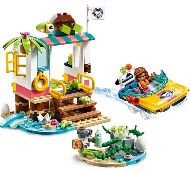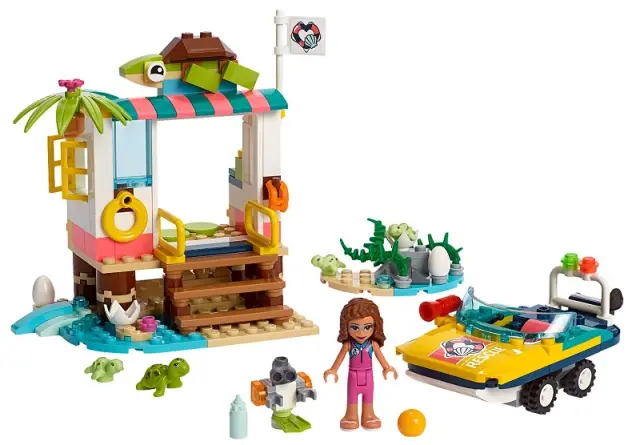 LEGO® Friends Olivii in Zobu pomagaj rešiti male nasedle želvice s kamnitega otočka. Na pomoč jim pošlji kulsko dvoživkasto vozilo. Želvice odpelji na obalo v kliniko za reševanje malih živali, kjer nanje že čaka zaskrbljena mama želva. Olivii pomagaj pregledati želvice, nato pa jih nahranita z mlekom in sadjem. Ko si bodo opomogle, se lahko igrajo v peskovniku, medtem ko čakajo, da se izvalijo še njihovi bratci in sestrice.