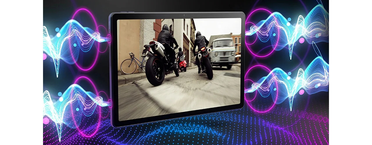 Osupljivemu 10,6-palčnemu zaslonu IPS ločljivosti 2K tablice Tab M10 Plus 3. generacije preprosto ni para. Pretakajte storitve Netflix, Disney+ in druge v ločljivosti do 1080p, kar je najvišja ločljivost videa, ki je na voljo za mobilne naprave. Poleg tega certifikat TÜV za manj modre svetlobe pomeni, da lahko udobno dolge ure uživate pred zaslonom, medtem pa vas sistem štirih zvočnikov obda z zvokom.