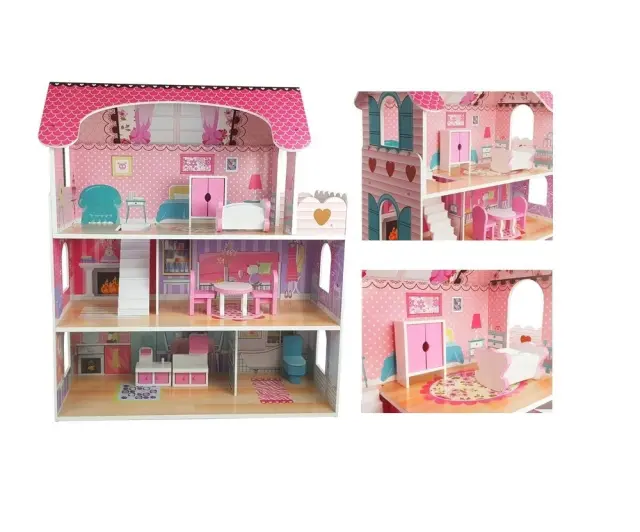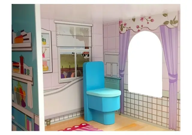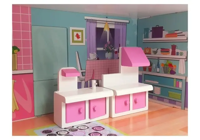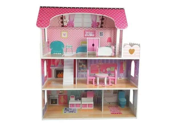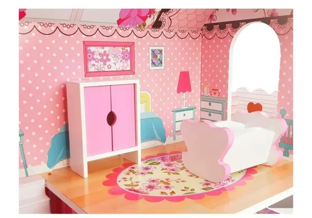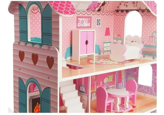Hišica za punčke ima tri nadstropja. V prvem so moderno opremljena kuhinja z vgradnim pohištvom in kopalnica, srednja je namenjena elegantni jedilnici, v mansardi pa je spalnica staršev in zibelka za majhnega otroka. Vse sobe imajo leseno pohištvo, ki ga je mogoče preurediti in okrasiti na novo. Zagotavljamo vam, da bo hišica za punčke Villa Milena malčke zabavala dolge ure in jim ne bo pustila dolgčas.