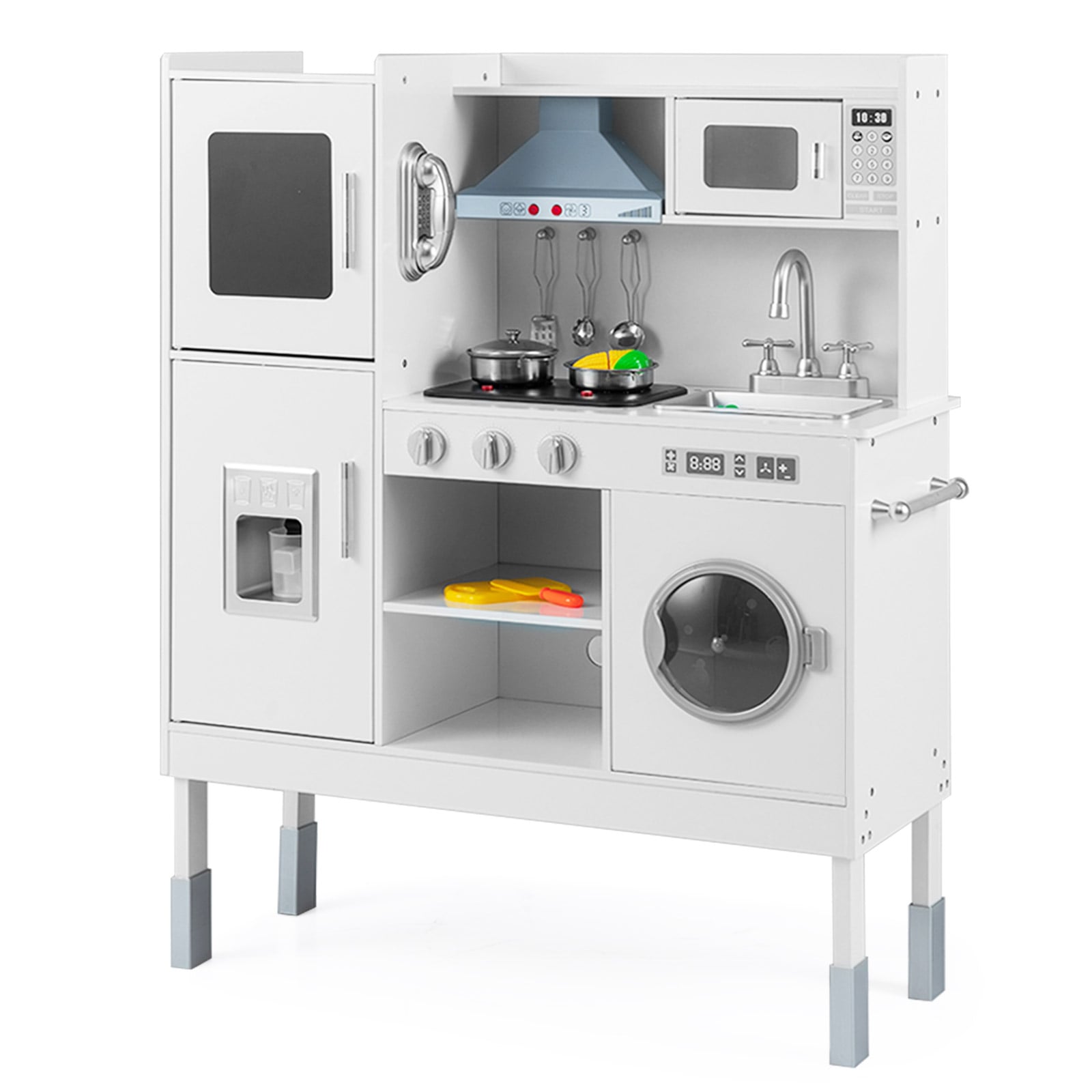 3-stopenjska nastavitev višine: ta kuhinja za igranje vlog ponuja možnost nastavitve višine na treh ravneh, zato lahko izberete želeno višino glede na svoje potrebe. Višino lahko preprosto prilagodite s snemljivimi in dvignjenimi pokrovi za noge.