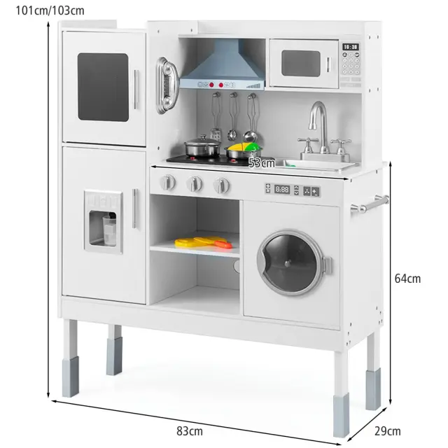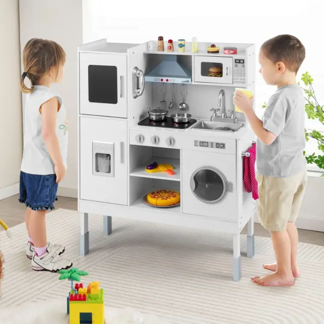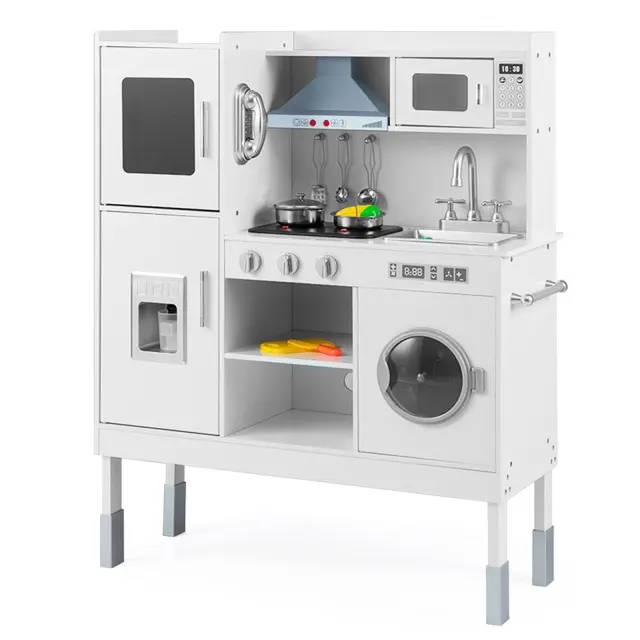 Naj se vaši otroci zabavajo ob kuhanju z našo otroško kuhinjo! Z visokokakovostnimi materiali in izvrstno izdelavo je ta kuhinja za igranje vlog izdelana tako, da zdrži. Poleg tega se zaradi nastavljive višine prilagaja hitri rasti otrok. Sesalni pokrov s pravimi zvoki in lučmi, vrtljiva pipa in stikala, odstranljivo pomivalno korito, mikrovalovna pečica, naprava za izdelavo ledenih kock in pralni stroj zagotavljajo veliko zabave za najmlajše. Za dodatno zabavo je na voljo tudi telefon. Otroška igralna kuhinja ima veliko dodatkov, ki malčkom omogočajo različne izkušnje. Po igranju lahko vse predmete zaradi številnih polic lepo pospravite, kar pri otrocih že od malega spodbuja dobre navade.