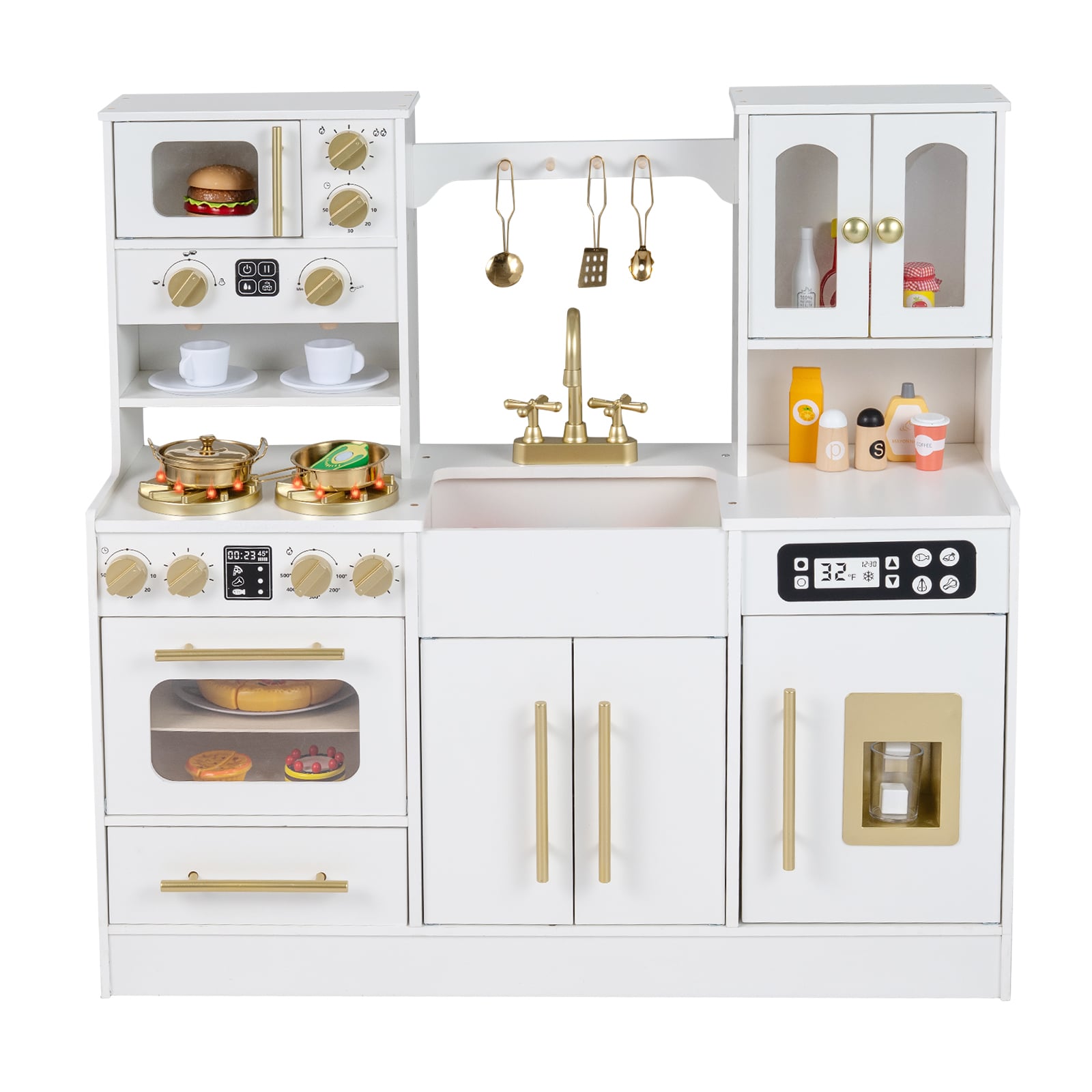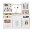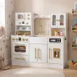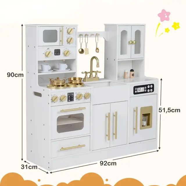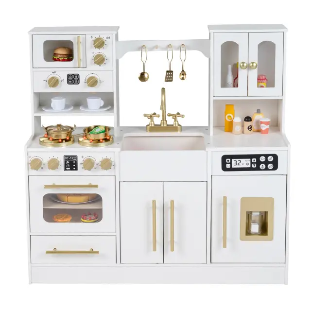Ta lesena igralna kuhinja ponuja zabavno in realistično izkušnjo kuhanja. Kuhinja je opremljena z realističnimi lučmi in zvoki, ki otroke spodbujajo k aktivnemu sodelovanju in posnemanju resničnega kuhanja. Vrtljivi gumbi prijetno klikajo in krepijo pristen vtis. Naprava za led daje domišljijske ledene kocke, mikrovalovna pečica, aparat za kavo in pečica pa omogočajo ustvarjalno pripravo jedi in pijač. Igralni umivalnik s pipo vabi k igranju vlog pri kuhinjskih opravilih, kot je čiščenje. S trdnimi podpornimi nogami in zaobljenimi robovi komplet zagotavlja varno in stabilno igralno površino. Ta igralni kuhinjski set, ki je opremljen z bogato ponudbo posode in velikim prostorom za shranjevanje, obogati otroško igro.