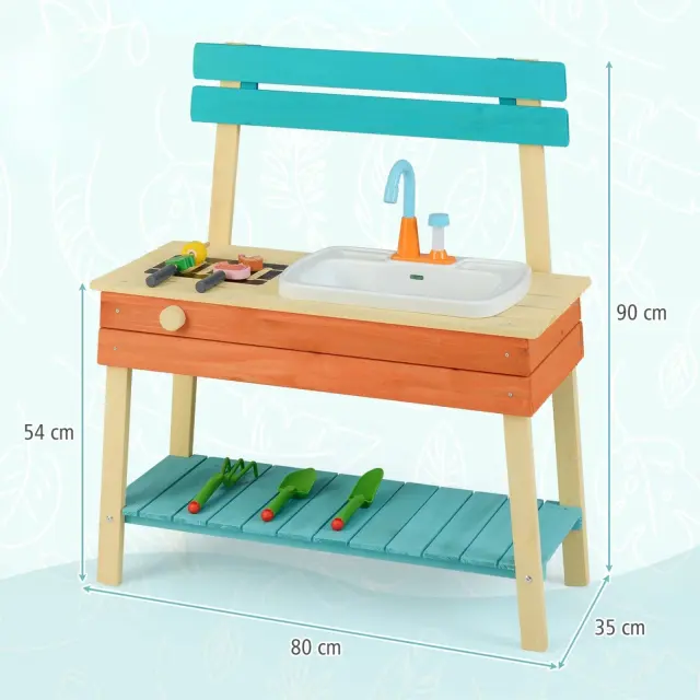 Spodbuja domišljijsko igro z blatno kuhinjo "vse v enem" za otroke. Ta interaktivni igralni set, opremljen s hrano za igro, nabodali in žarom, spremeni zunanji prostor v kulinarično pustolovščino. Otroci lahko uživajo v vsestranski pipi s skritim rezervoarjem za vodo za neskončno zabavo z vodo. Robusten kuhinjski set iz jelovega lesa z gladkimi robovi in varnimi nogami je opremljen z vrtnim orodjem. Delovni pult, visok 54 cm, je idealen za igro vlog in spodbuja ustvarjalnost, motorične spretnosti in socialno interakcijo, saj je kot nalašč za otroke od 3 do 8 let. S priloženim orodjem zgradite svoj mali vrt in pustite otrokom, da odkrivajo naravo.