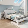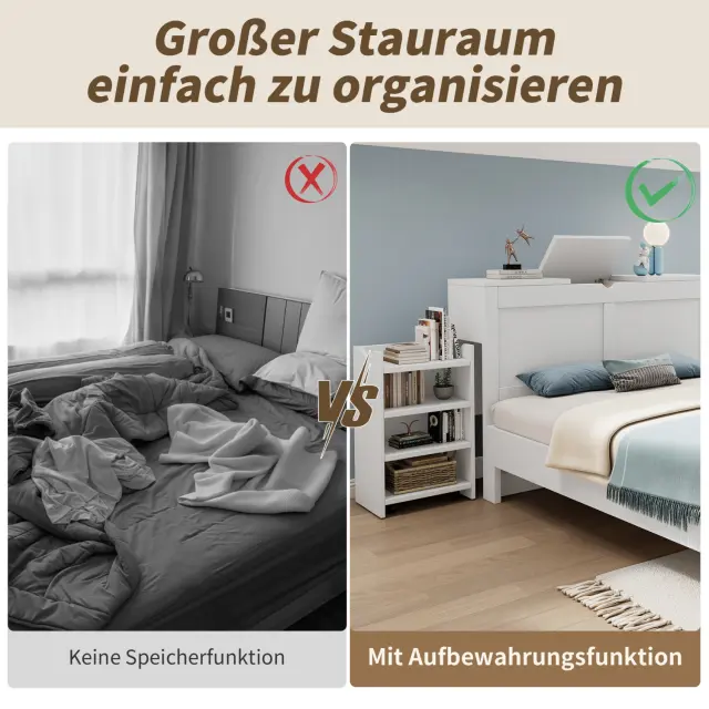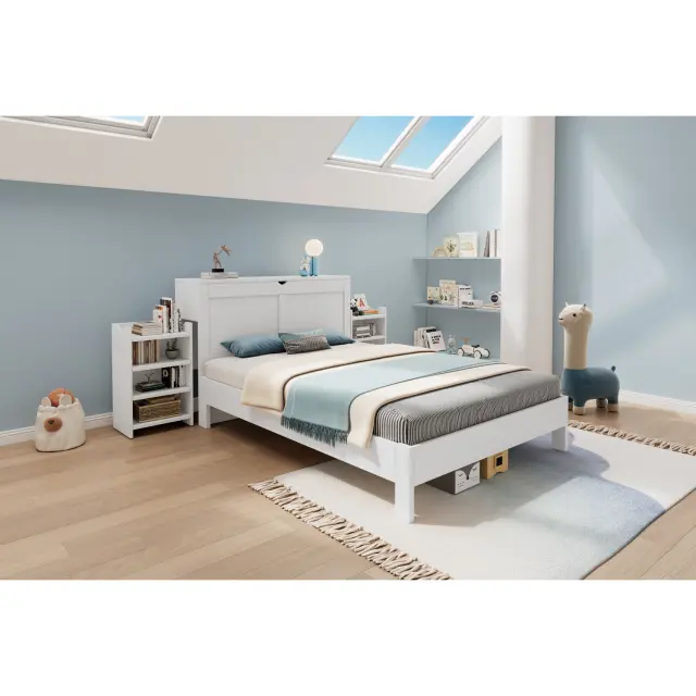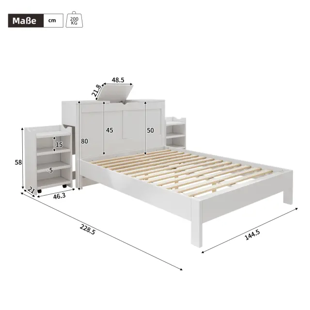 Lesena postelja 140x200 z letvenim okvirjem, vzglavjem, 2 nočnima omaricama in prostorom za shranjevanje, bela