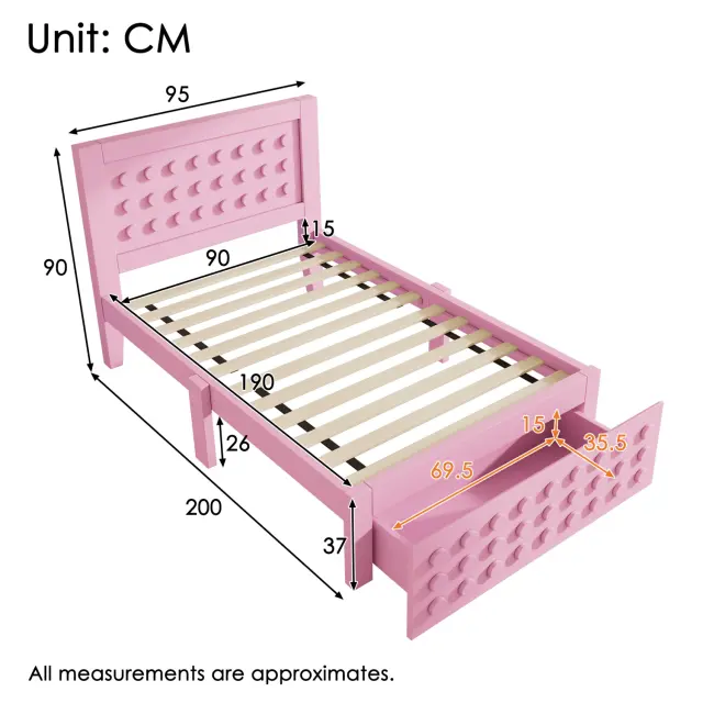 Lesena postelja 90x190 cm, otroška postelja z blokovnim dizajnom in prostorom za shranjevanje, roza