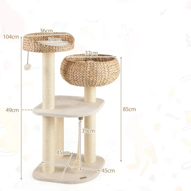 Dober material in izdelava: Stebri so oviti v 100-odstotni naravni sisal. Podstavek je prav tako izdelan iz lesenih materialov ter je močan in stabilen. Postelja in votlina sta izdelani iz naravne vodne hiacinte, mehka tkanina pa je zelo udobna.