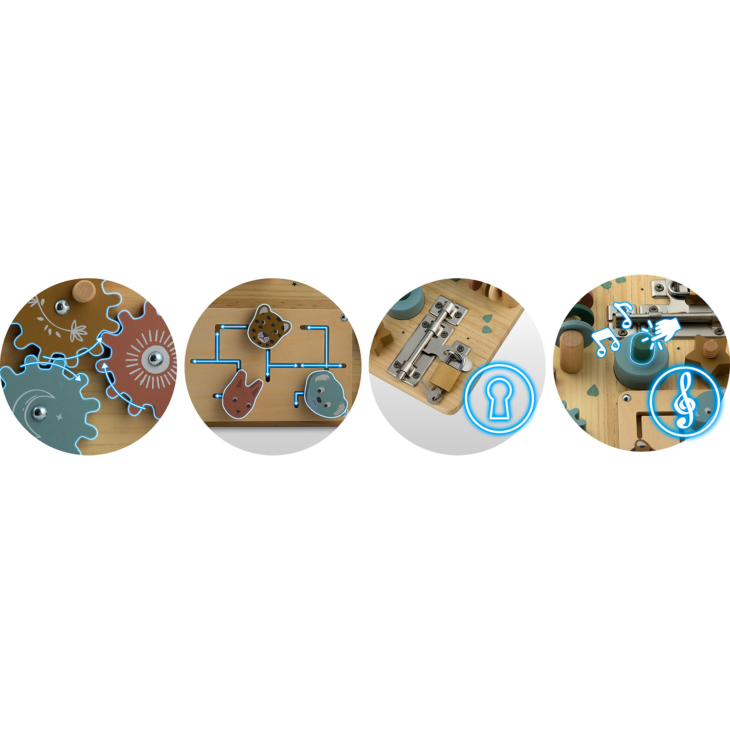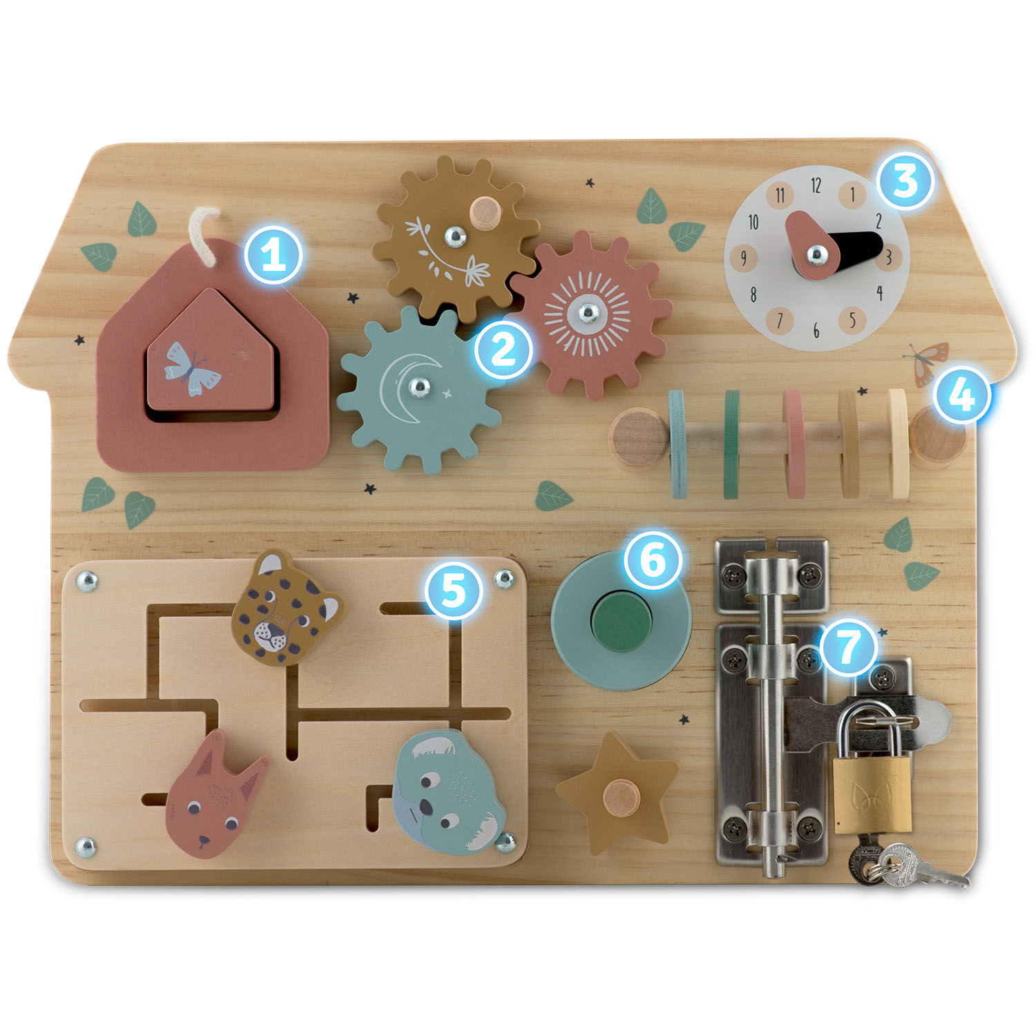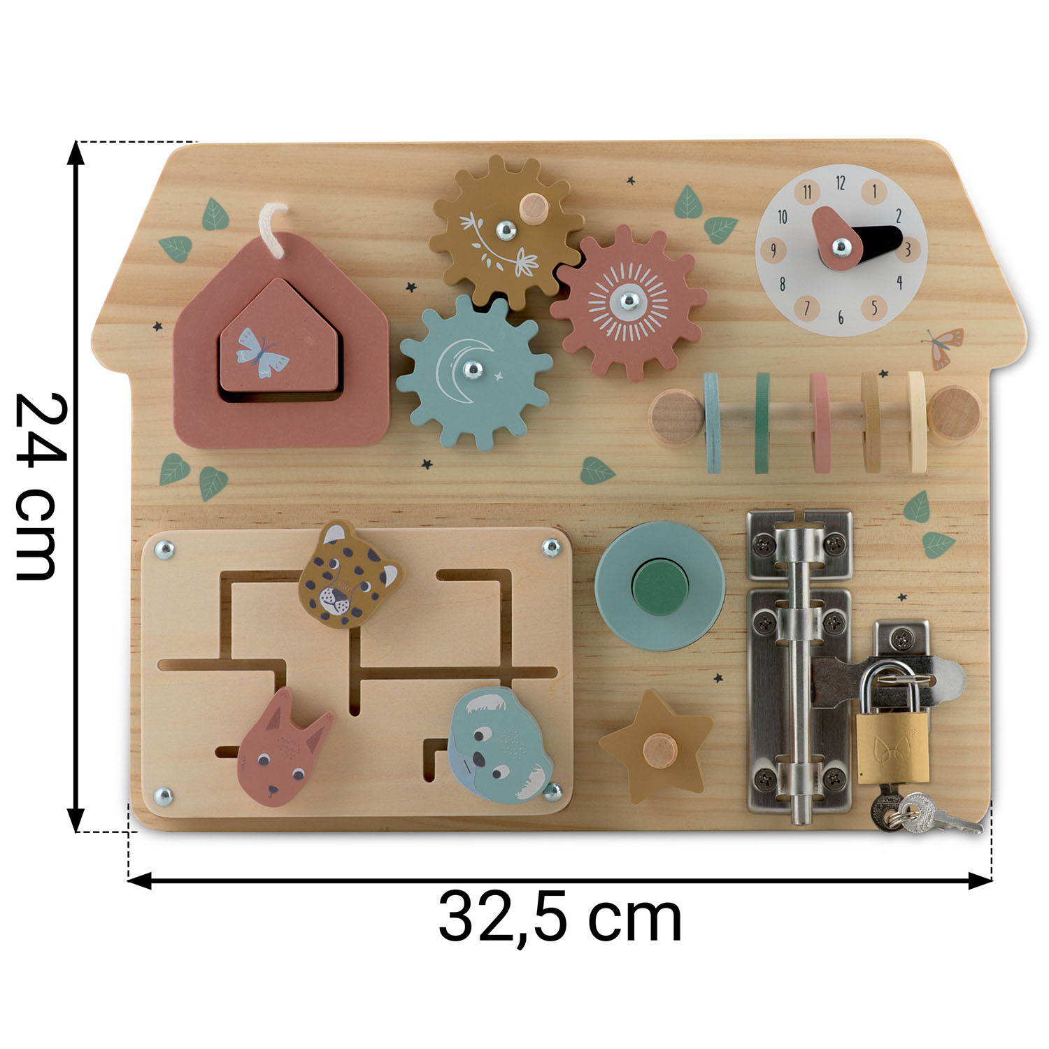 Senzorna igrača Nukido LESENA TABLA: NK-859 ⭐ Razvoj fine motorike: Tabla je opremljena z različnimi mehanizmi, kot so ključavnice, zobniki in gumbi, ki podpirajo razvoj fine motorike. ⭐ Stimulacija čutov: Širok nabor elementov z različnimi teksturami in gibljivimi deli stimulira čutila za dotik in vid. ⭐ Navdih Montessori: Senzorična tabla, navdihnjena z metodologijo Montessori, spodbuja učenje z delom in otroku omogoča, da samostojno odkrije funkcijo vsakega elementa. Glavne lastnosti: trdna in trpežna, izdelana iz varnih in naravnih materialov, podpira učenje: štetja, oblik in barv, igrača bo otroka dolgo zanimala, podpira razvoj fine motorike, ima certifikat EN71, ki dokazuje varnost. ⭐⭐⭐⭐⭐ Igrače iz naravnega lesa znamke Nukido: Vzdržljivost in vrhunska kakovost - Igrače iz naravnega lesa odlikujejo dolga življenjska doba in odpornost na poškodbe, kar pomeni, da so uporabne več let. Njihova trdna konstrukcija zagotavlja varnost in zanesljivost, kar se odraža v zadovoljstvu staršev in otrok. Neskončna zabava – veliko možnosti: Škatla za žuželke – zabava s kocko in obročem. Zobniki - Raziskovanje delovanja vrtenja in gonila. Ura - učenje ur in delovanja ure. Abakus. Labirint - iskanje in načrtovanje poti in poti. Gumb z melodijo in navoj z matico - poigravanje z zvokom in privijanje zvezdice na navoj kot vijak. Ključavnica in ključavnica. Skrbno izdelani detajli, ergonomsko prilagojeni otroškim rokam! ✔ Popolna za potovanje: to je ročna igrača, ki jo zlahka vzamete s seboj na potovanje, še posebej v avtu. Zahvaljujoč enodelni konstrukciji se nič ne izgubi in otrok se bo dolgo časa ukvarjal z ročno igro. Popolna rešitev za zabavo malčkov med potovanjem in hkrati podpira njihov razvoj. Naš izdelek se bo zaradi barvite embalaže odlično obnesel kot darilo.