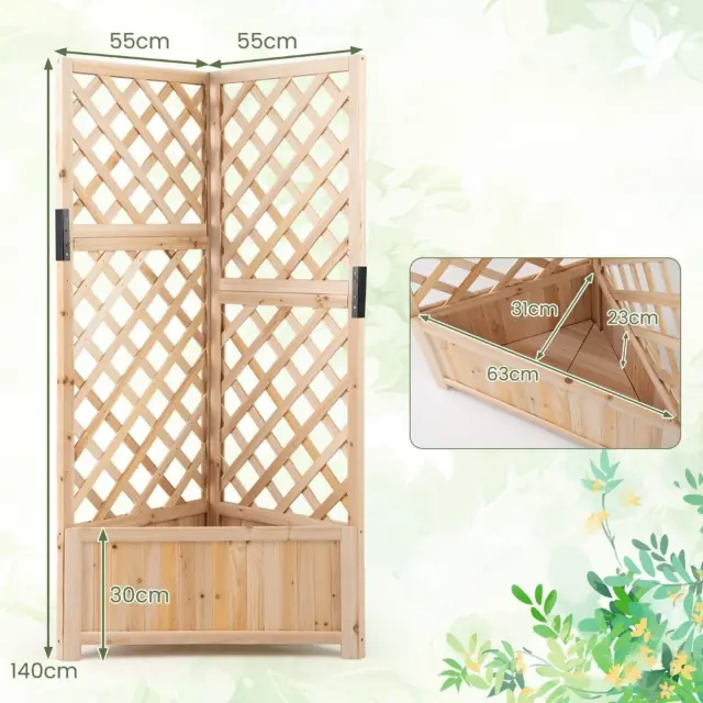 Edinstvena kotna oblika: ta leseni sadilnik meri 55 x 55 x 140 cm (d x š x v) in ima domiselno trikotno obliko, ki se odlično prilega kotu 90°. Poveča prostor na terasah, balkonih ali neizkoriščenih vrtnih kotih in ponuja eleganten, po meri izdelan videz.