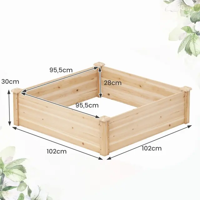 Prostorna površina za sajenje: Kvadratna škatla za sadike meri 102 x 102 cm (d x š) in ponuja dovolj prostora za gojenje različnih vrst rastlin. Ne glede na to, ali gojite zelenjavo, zelišča ali rože, dvignjena greda zagotavlja popolno okolje za vaše vrtne projekte.