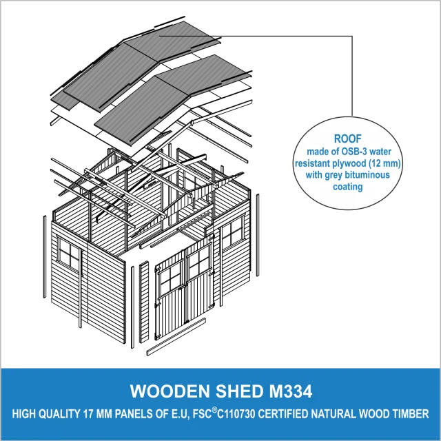 Lesena vrtna hiša - H226x324x216 cm/6 m² - Panelna konstrukcija, Vrtna lopa brez podov - TIMBELA M334