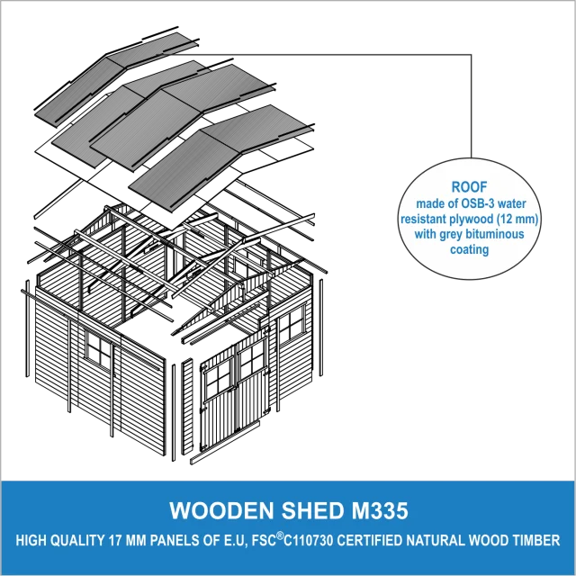 Lesena vrtna hiša - H226x324x316 cm/9 m² - Panelna konstrukcija, Vrtna lopa brez podov - TIMBELA M335