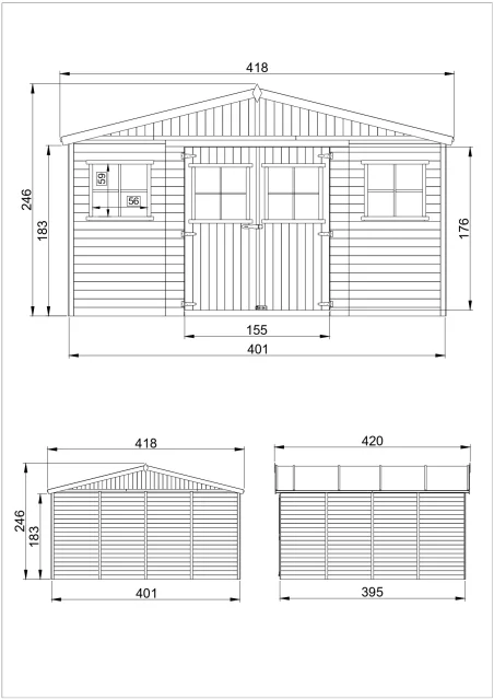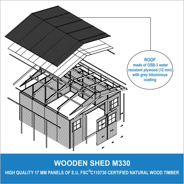Lesena vrtna hiša - H246 x 418 x 420 cm/ 16 m² - Panelna konstrukcija, Vrtna lopa brez podov - TIMBELA M330
