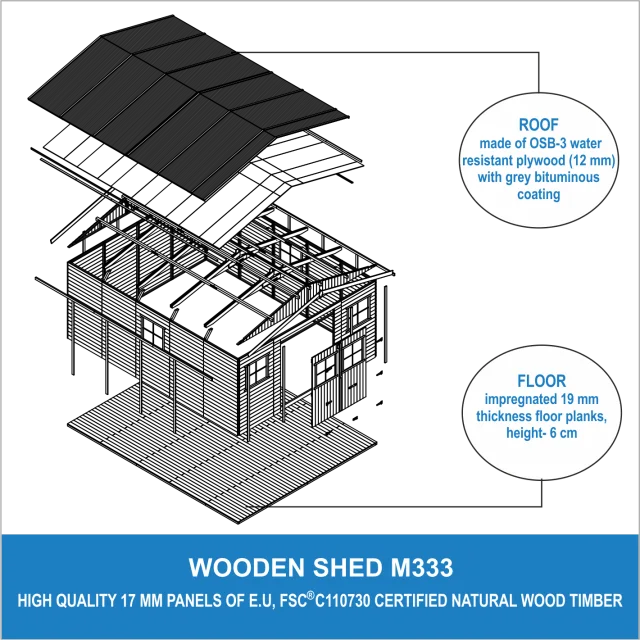 Lesena vrtna hiša - H246x418x522 cm/20 m² - Panelna konstrukcija, Vrtna lopa s podi - TIMBELA M333+M333G